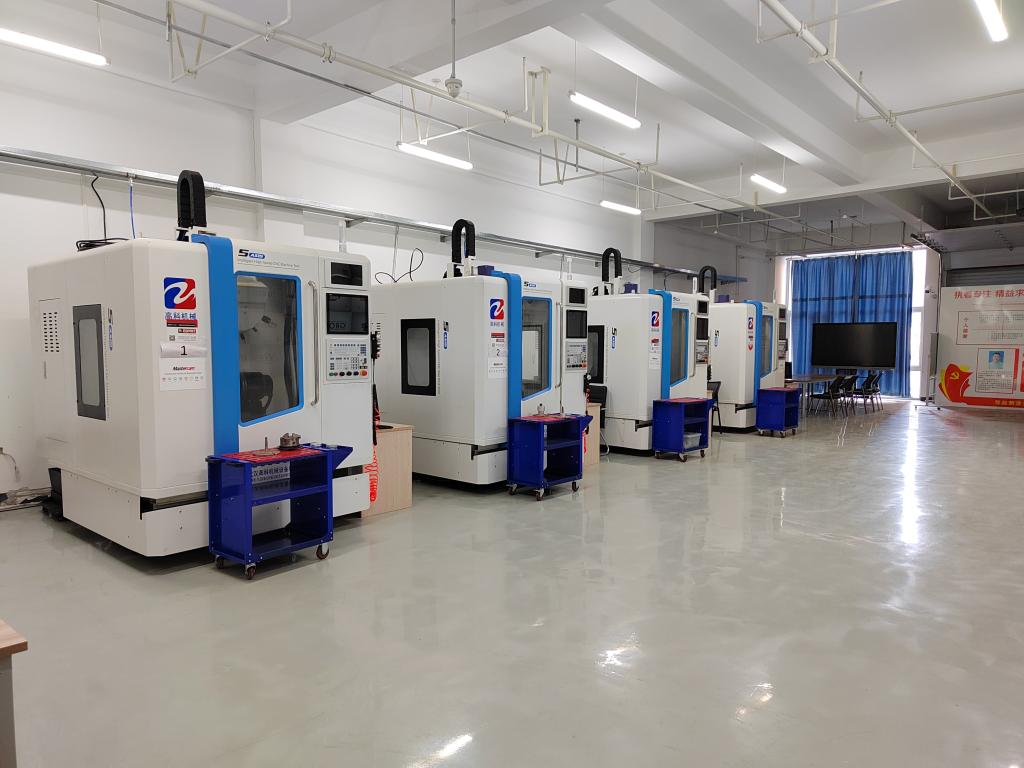 本实训室配备五轴联动加工机床4台,主要承担《机械CAM》《数控技术》《典型模具制作》等课程教学任务。五轴联动机床是行业内加工复杂零件的必备设备,也是学生进入高端制造企业的敲门砖,实训室设备集典型性和先进性于一体,学生可以在此开阔视野、锤炼技能。