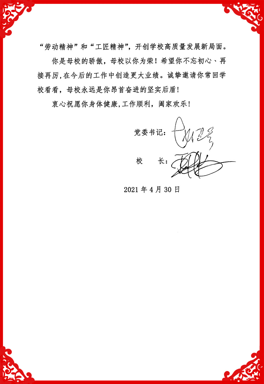 刘加良是母校的骄傲,母校以刘加良为荣!全校师生要以刘加良为榜样,弘扬劳模精神、劳动精神、工匠精神和“龙职”精神,积极践行学校价值理念“当好学生的铺路石,当好产业的铺路石,当好民族复兴的铺路石”,开创学校高质量发展新局面。