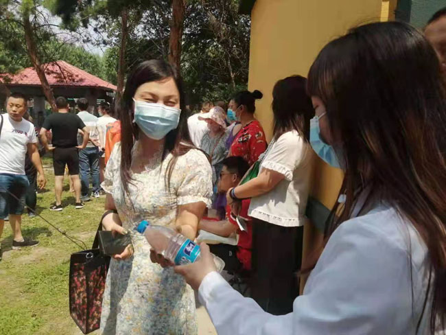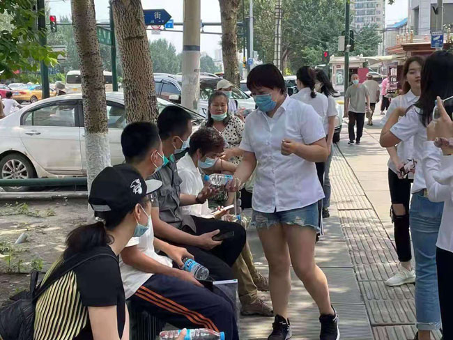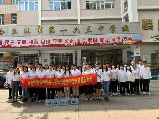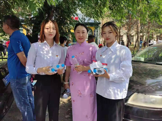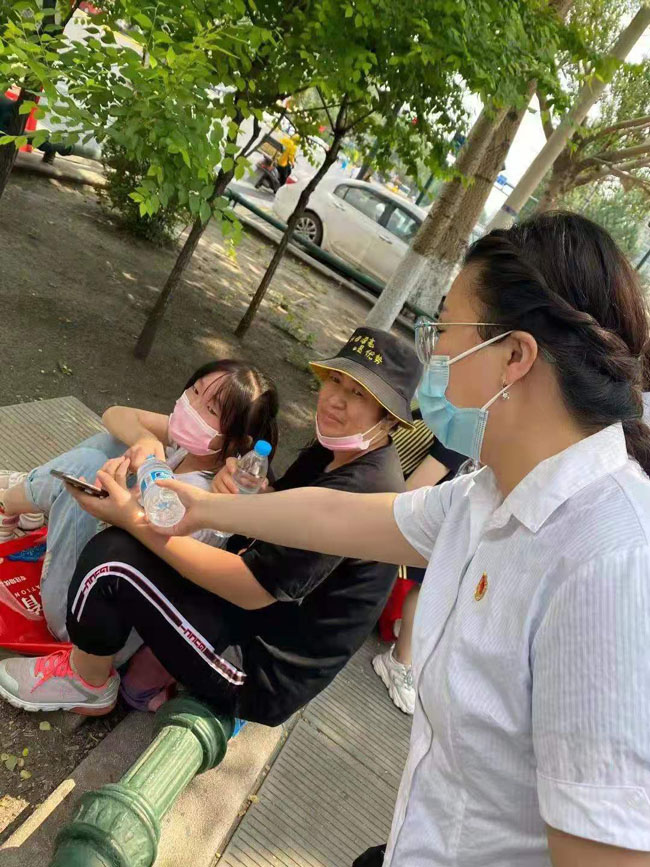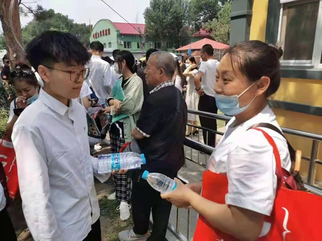 2021年6月25日,学管党支部全体教工党员和学生党支部新党员在“党员之家”进行入党誓词重温和新入党党员宣誓后,组织支部党员走向社会开展志愿服务活动,为中考的考生和家长义务送水。