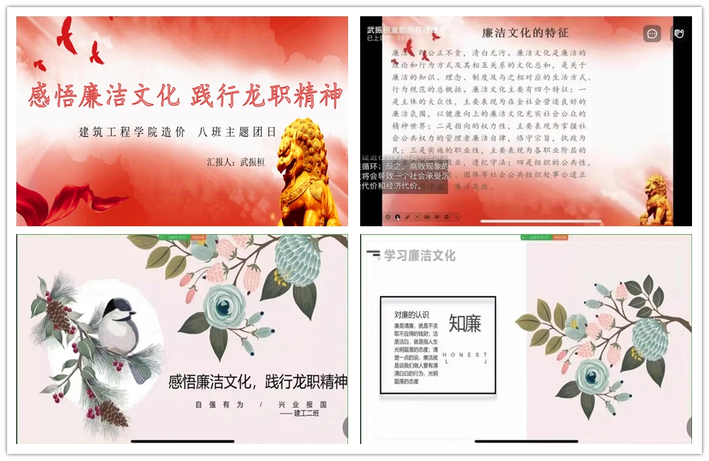 为进一步推动我院廉洁文化建设,培养我院学生养成“知廉、爱廉、行廉”的道德情操和模范行为,将廉洁文化充分与“自强有为,兴业报国”的龙职精神相结合,建筑工程学院于11月17日特此开展“感悟廉洁文化,践行龙职精神”线上主题团日活动。