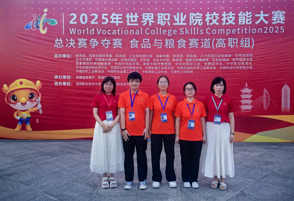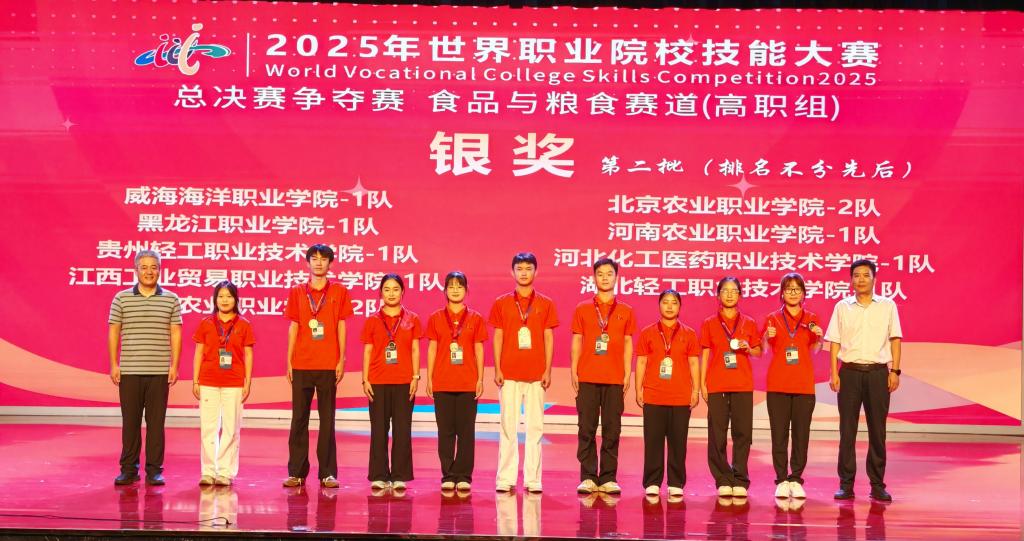 8月26日,2025年世界职业院校技能大赛食品与粮食赛道(高职组)在芜湖职业技术大赛圆满落幕。来自全国31个省(自治区、直辖市)的94所高职院校100支代表队343名选手齐聚一堂,共同开启以“技炫青春、能创未来”为主题的技能盛宴。该赛道紧密围绕国家粮食安全战略和产业发展需求,聚焦食品加工、食品安全检测、粮食储存与加工等关键领域,全面考查选手的综合技能与创新能力。在这场高水平角逐中,我院院长韩双亲自带队指导,马艳梅教师、2024级学生衣然、杨灿灿、孙珑珀组成的代表队,凭借扎实的专业理论功底、精湛的实操技艺与稳定的现场发挥,在唯一一组11支强劲对手中脱颖而出,以第二名的优异成绩成功摘得银奖。这一突破不仅刷新了我院在该赛事中的历史最好成绩,更充分彰显了我院在食品与粮食专业领域的教学硬实力与高质量人才培养成果。