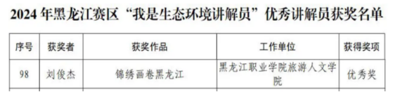 为深入贯彻落实习近平生态文明思想,推动全民生态环境科学素质全面提升,生态环境部组织开展2024 年“我是生态环境讲解员”活动。近日,由省生态环境厅、省教育厅和省科协联合开展的2024年黑龙江赛区“我是生态环境讲解员”活动收官,经过激烈角逐,伟德官网马克思主义学院康帅老师指导“初心”小队成员、旅游人文学院学生刘俊杰的原创词曲作品《锦绣画卷黑龙江》获得黑龙江赛区“我是生态环境讲解员”优秀奖。
